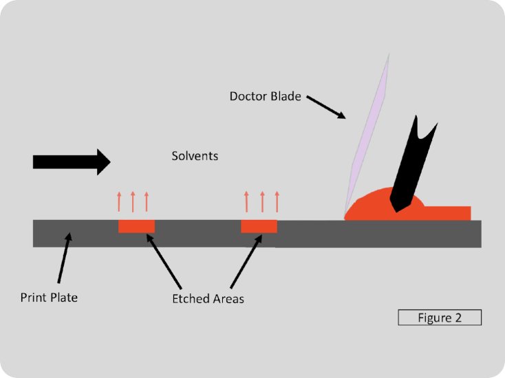 The top surface of the plate is cleaned using doctor blade, leaving the printing ink in the etched area containing the image.