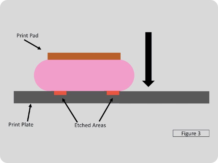 The transfer pad is compressed onto the surface of the plate in an even, rolling action, pushing air out of the way as it compresses. As the solvent evaporate from the surface of the ink, the increased tackiness of the exposed ink surface enables it to stick to the pad and be transferred to the pad from the etched surface of the printing plate.
